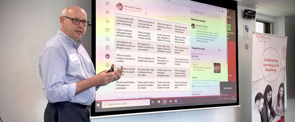 | Analysis and report on information or data in a graph, or an infographic | Interpretation of visuals is an important skill for student to learn. More importantly it is hard for an AI engine (at this point) to do this for you. Presenting table-based data in image form (screen capture) with further enhance this. Equally it’s important for students for students to learn how to summarise information in a concise way. Presenting a visual to a student in an online test and asking them to provide an interpretation either verbally or in writing can be done in most LMSs or online exam platforms. You could ask student to record themselves doing this and have them submit the recording. Instructing students how to do this in Zoom or in PowerPoint live is one way, without having to bye expensive screen recording software. |